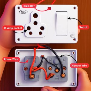 The phase wire (red) goes first to the switch, then to the socket. The neutral wire (black/blue) connects directly to the socket and indicator. The indicator is connected parallel to the socket. The earth wire (green) goes directly to the socket’s earth terminal.